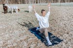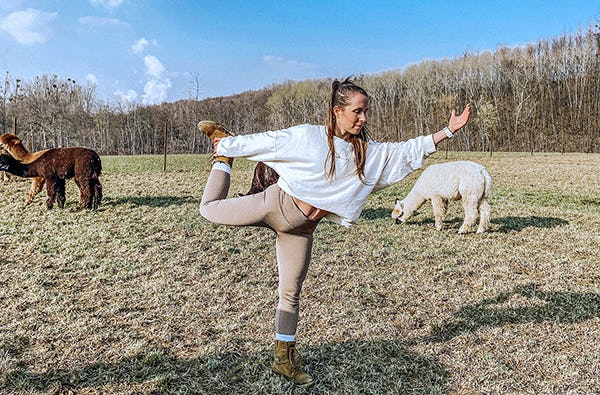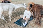 - Yoga inmitten der grünen Wiese umgeben von Alpakas